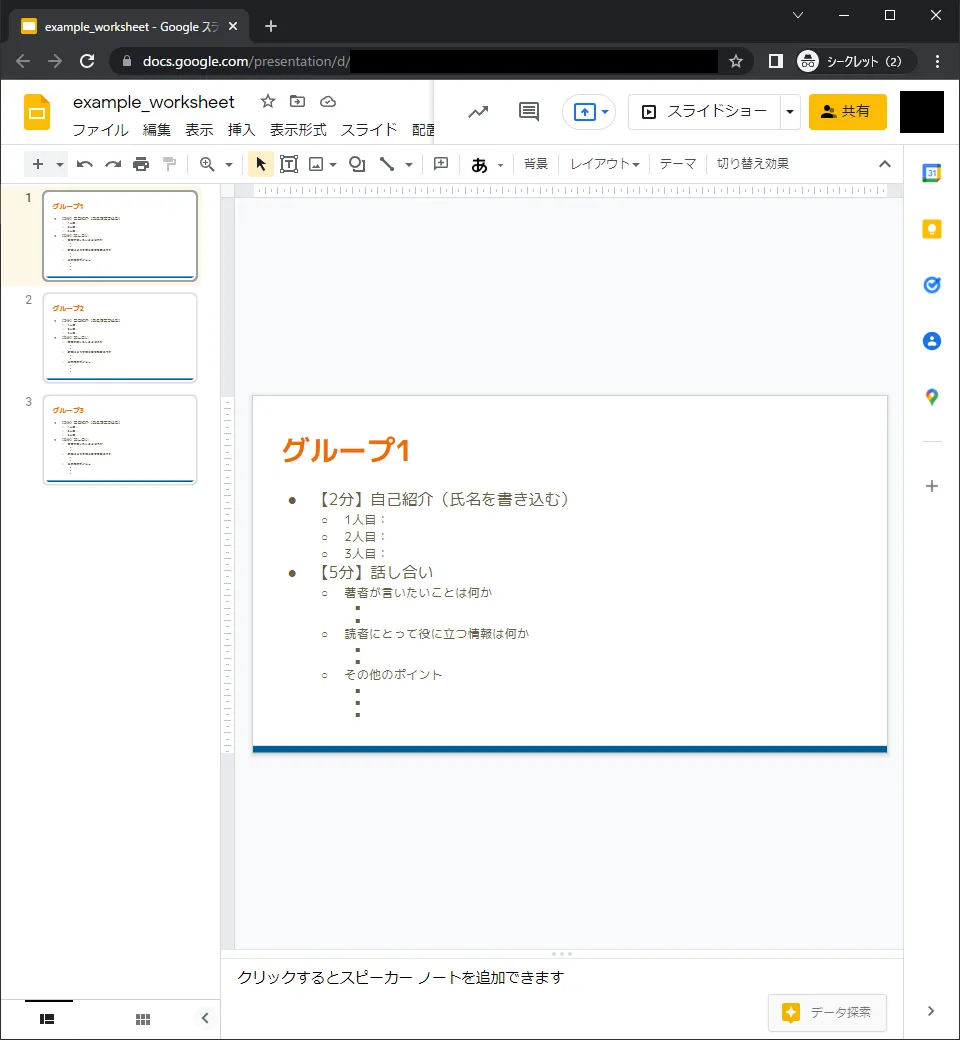 予めワークシートのテンプレートをグループの数に合わせて用意しておくと,URLを配布してすぐにディスカッションを始めることができます.