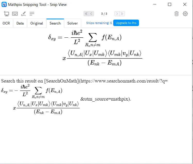 すると上のように,マウスで書いたような読みにくい文字でも(一部誤変換はありますが)かなりよい精度で,数式として読み取ってくれます.(無料版では1カ月に10回.それ以上は有料のMathpix Proに申し込む必要があります.)