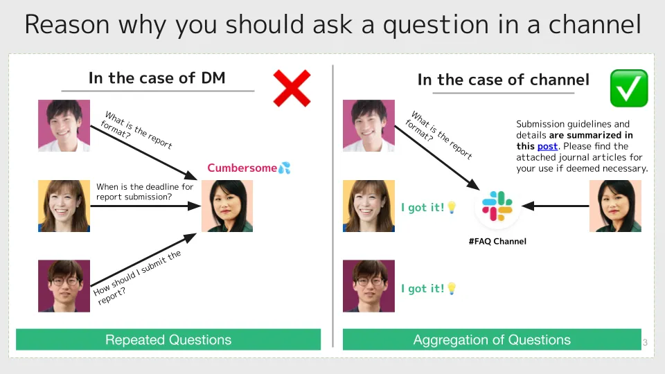 - You can also mention(notify) students who have asked questions by prefixing their registered name in Slack with @.