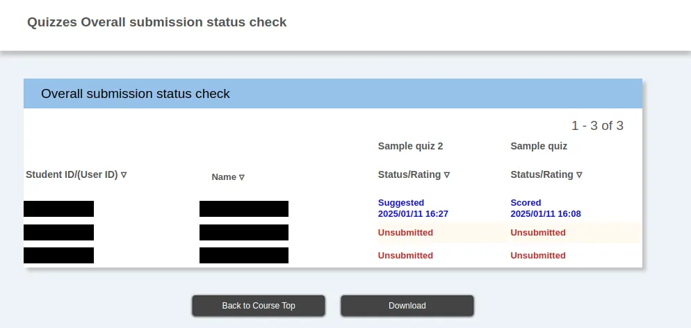 This function allows you to check the submission status of tests in the course as one unit for scoring purposes. To check the submission status of all tests, click on “Check all submission status” in the “Quizzes” section of the “Course Top” screen.