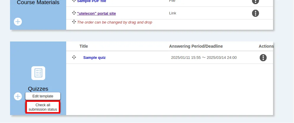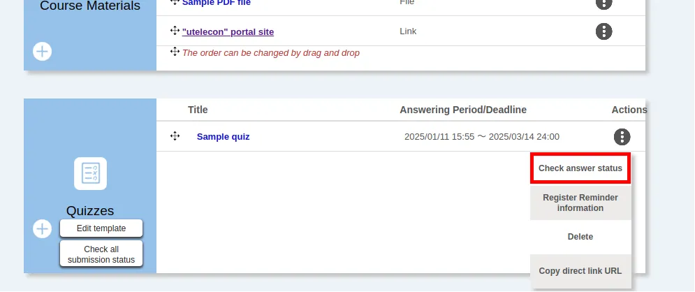 1. Click on “Check answer status” in the “︙” button on the right of the “Quizzes” column on the “Course Top” screen.