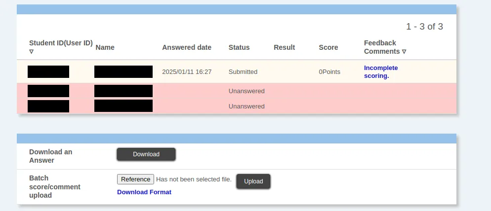 4. If the file is uploaded successfully, the scores and feedback comments in the Excel file for scoring will be loaded, and the status column for the scored students in the “Answer Status” screen will change to “Marked” or “Entered by the instructor”.