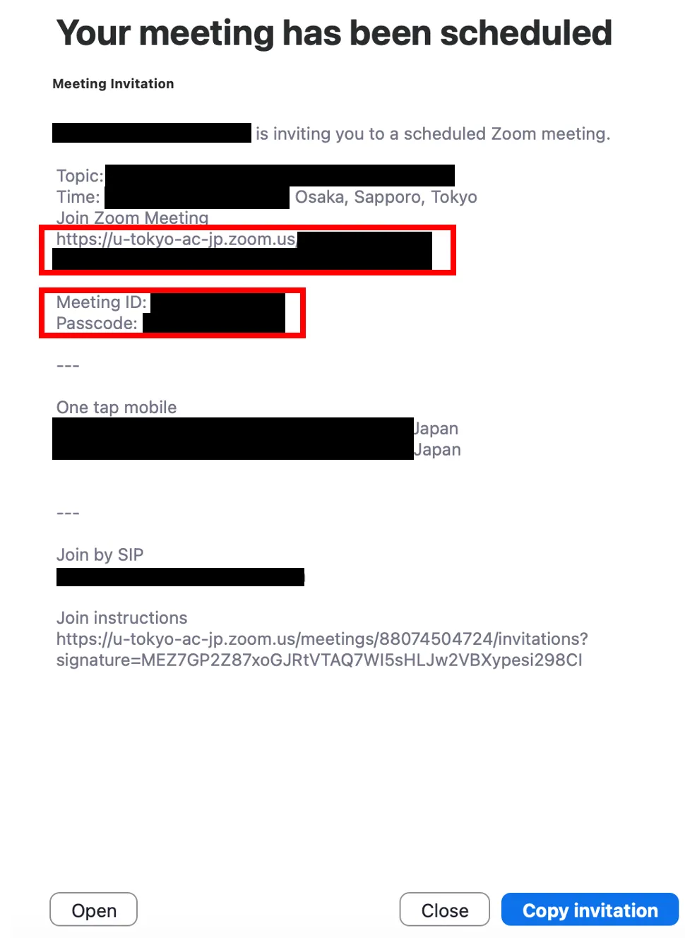 - Press “Save” in the lower right corner. In the previous screen, if you selected “Other calendars” for “Calendar”, a screen such as that shown below will appear. Select the meeting URL, meeting ID, passcode, e.g., listed under “Join Zoom Meeting” and notify the participants by e-mail.