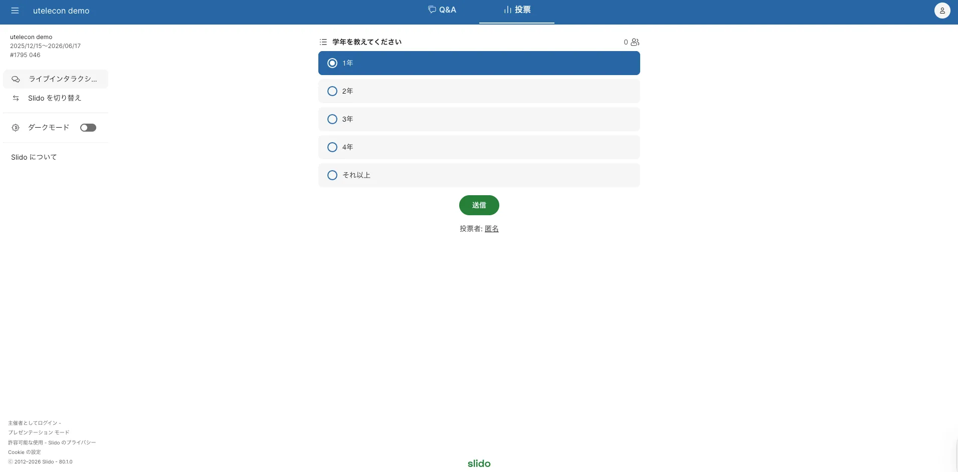 画面上部の「投票」を選択すると,主催者からの質問やアンケートに答えることができます.