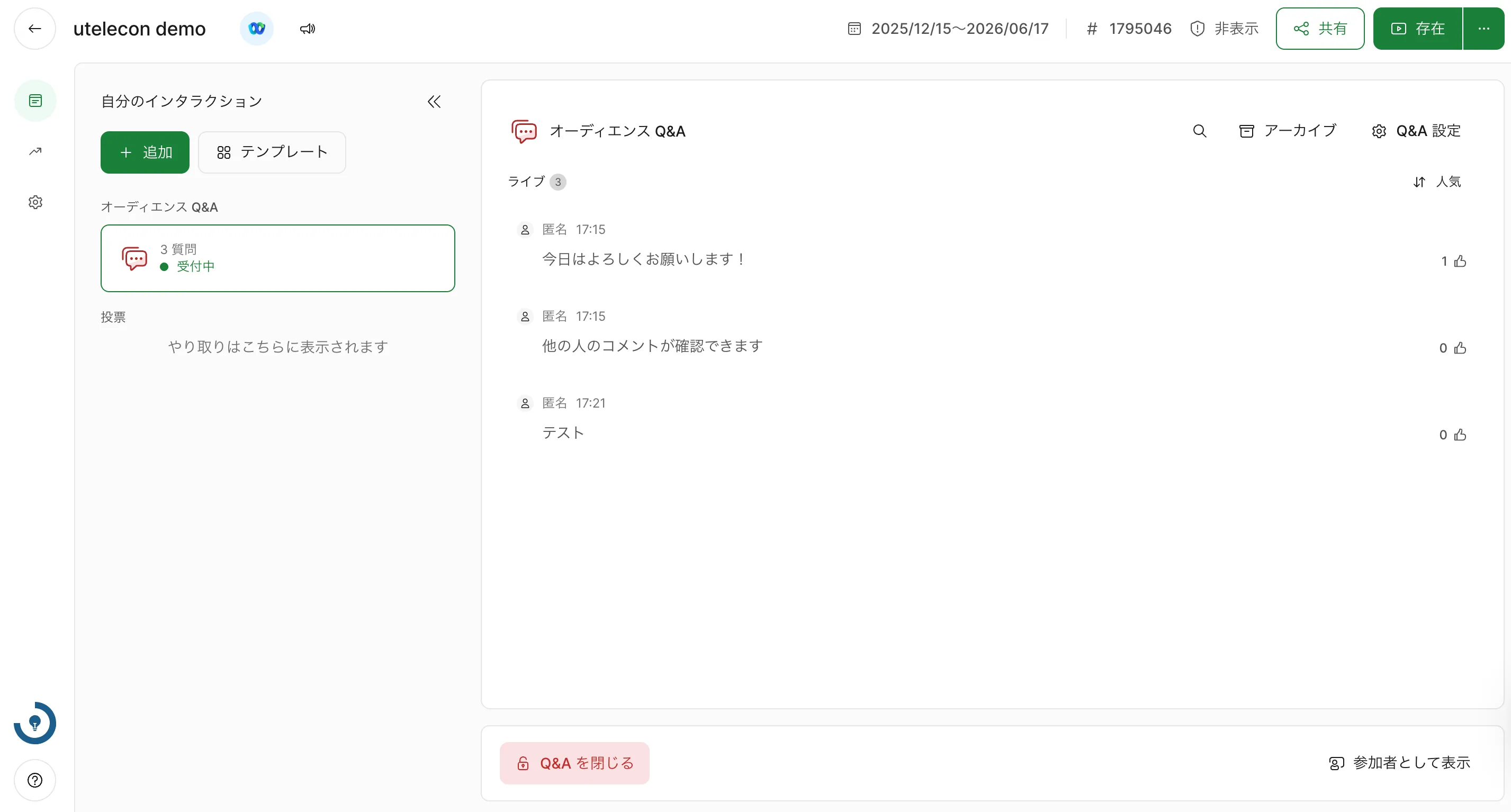 Q&Aを作成するには,画面左上または「新しいインタラクションを追加」内の「オーディエンス Q&A」を選択してください.