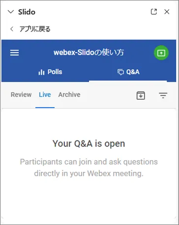 - 基本的な操作はウェブで実施するSlidoと同じ操作です.