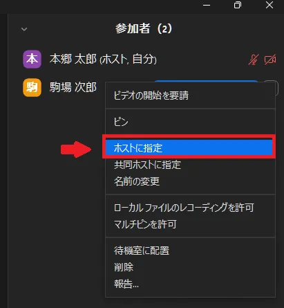 - 表示されたケバブメニュー(「…」のアイコン)をクリックし,「共同ホストに指定」を選択してください.