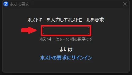 ホストは,あらかじめ他のユーザーに「ホストキー」とよばれるコードを共有しておくことで,ミーティング開始時に自身が不在の場合であっても,代わりに他のユーザーにホストを務めてもらうことができます.この機能は,ホストがミーティングに遅れて参加する場合3で,他のユーザーに一時的にホストを担ってもらいたい場合などに利用します.この場合,元々のホストがミーティングに参加すると「共同ホスト」に割り当てられますが,「ホストの再要求」を行うことでホストに復帰することが可能です.