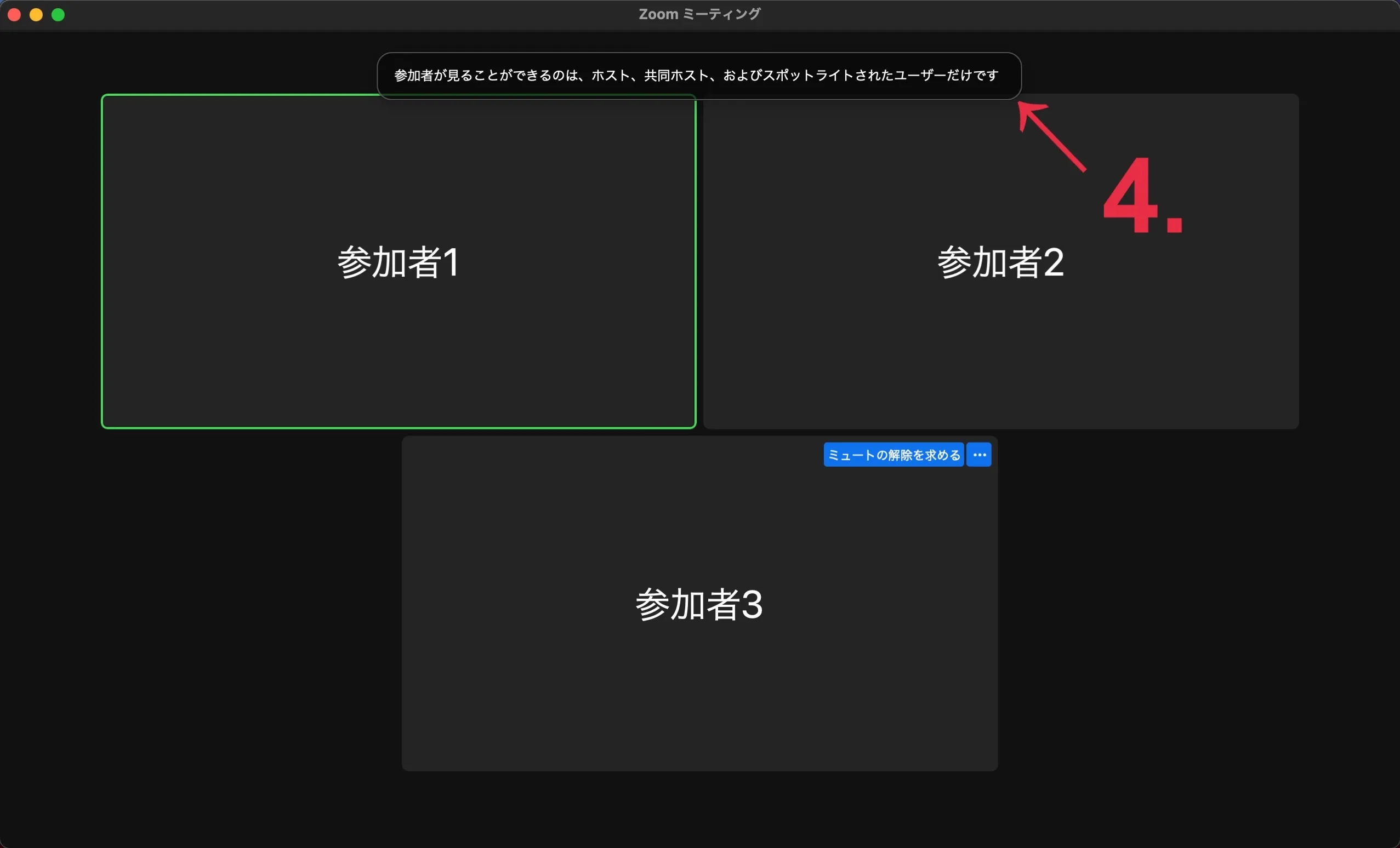 - 画面上部に「参加者が見ることができるのは,ホスト,共同ホスト,およびスポットライトされたユーザーだけです」という通知が表示されれば正しく設定できています.